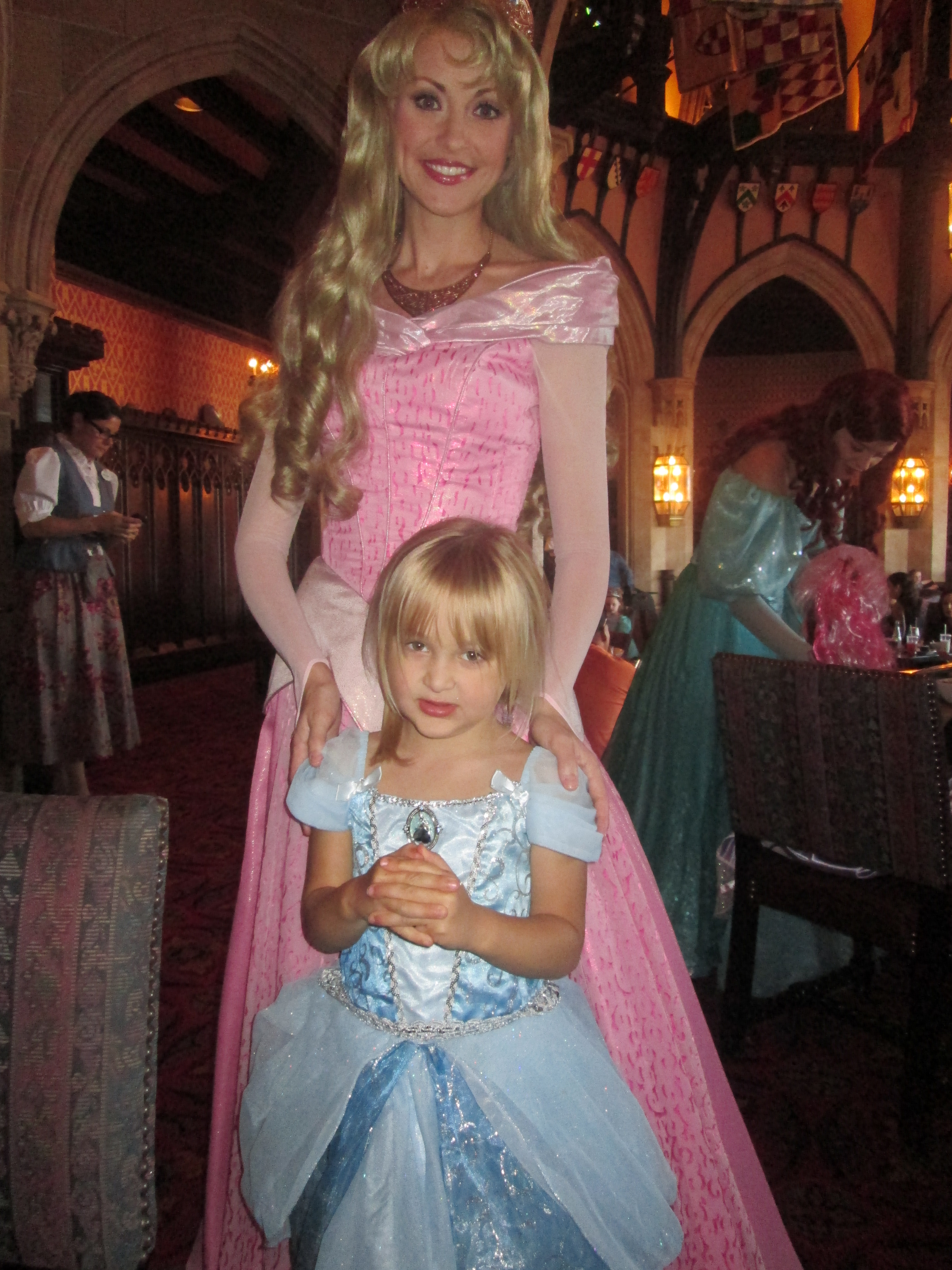 We of course had lunch at the Royal Table in Cinderella’s Castle, where, for the only time during the trip, we became these parents: “You will get pictures with these damn princesses and eat your $30 chicken nuggets and LIKE IT!! We didn’t spend $250 for you to sit and stare at them!!!” And photos we got. Nevermind the fact we were caught off guard and didn’t have time to run a comb through our poor girl’s hair.